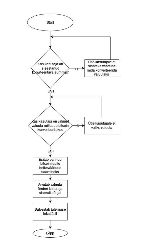 Teisendamine algab sellega, et kasutaja sisestab Bitcoini summa ja valib valuuta, millesse soovib selle konverteerida. Programm kontrollib esmalt, et sisestatud andmed oleksid korrektsed – summa lahter